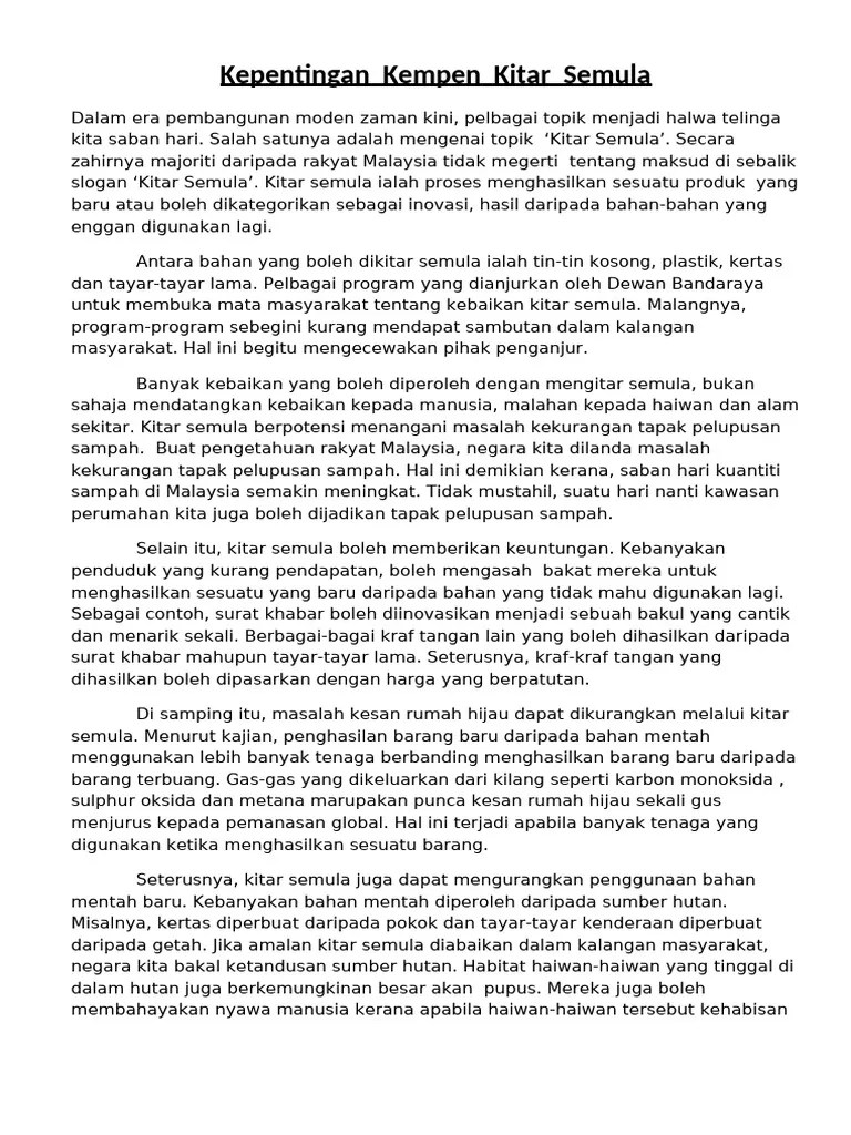 Aug 05, 2010 · kitar semula ialah proses mengolah semula bahan buangan untuk menghasilkan barangan yang baru. • terdapat segelintir penduduk yang tidak mempedulikan amalan kitar semula ini. Tidak mustahil, suatu hari nanti kawasan perumahan kita juga boleh dijadikan tapak. Antara punca dan halangan utama yang menyebabkan amalan kitar semula ini tidak mendapat sambutan ialah sikap individu dimana terdapat. Hal ini demikian kerana, saban hari kuantiti sampah di malaysia semakin meningkat.